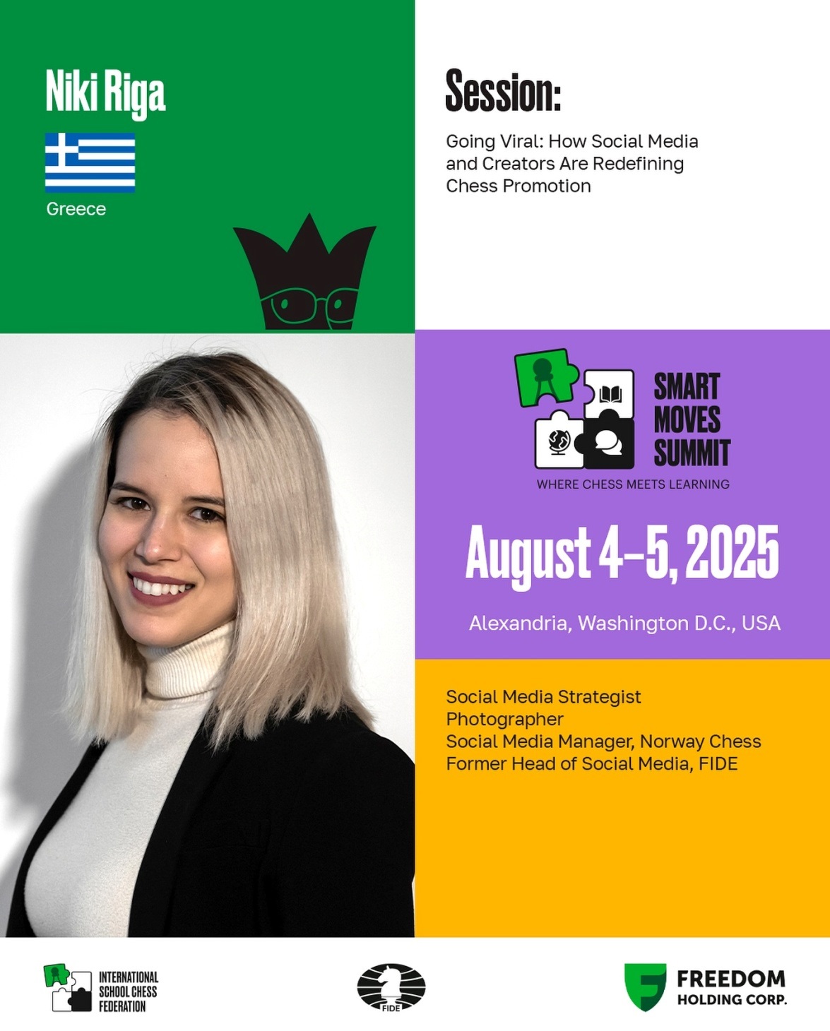 Η Νίκη Ρήγα — Social Media Strategist, φωτογράφος, και πρώην επικεφαλής των κοινωνικών δικτύων της FIDE — θα μιλήσει για το πώς τα social media αλλάζουν το πρόσωπο της σκακιστικής προβολής και συμμετοχής.