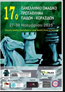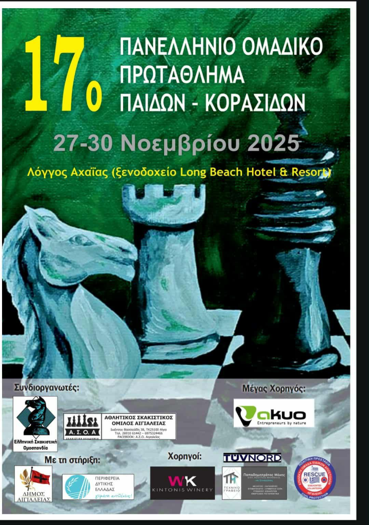 Αρχίζει σήμερα Πέμπτη 27/11 η Τελική Φάση του του 17ου Πανελλήνιου Ομαδικού Πρωταθλήματος Παίδων – Κορασίδων μέχρι 16 ετών 2025 που θα διεξαχθεί στο Λόγγο Αχαΐας (ξενοδοχείο Long Beach Hotel & Resort) με συνδιοργανωτή το σωματείο ΑΘΛΗΤΙΚΟΣ ΣΚΑΚΙΣΤΙΚΟΣ ΟΜΙΛΟΣ ΑΙΓΙΑΛΕΙΑΣ (ΑΣΟΑ) και την πολύτμη στήριξη του Δήμου Αιγιαλείας και της Περιφέρειας Δυτικής Ελλάδας.
