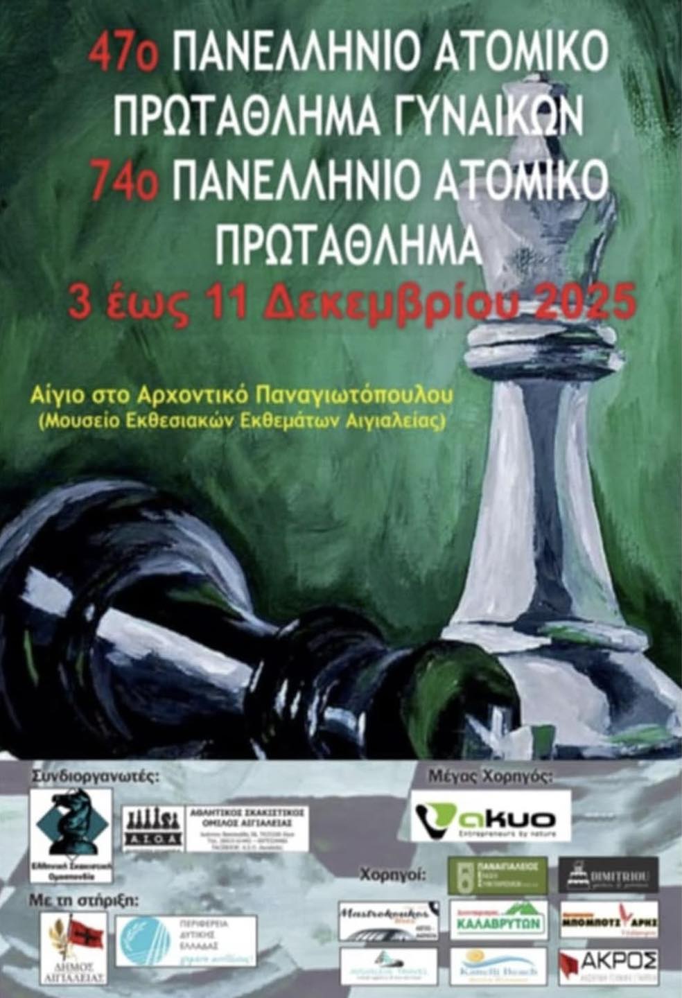 Στο Αίγιο, στο Αρχοντικό Παναγιωτόπουλου (Μουσείο Εκθεσιακών Εκθεμάτων Αιγιαλείας), θα διεξαχθούν το 74ο Πανελλήνιο Ατομικό Πρωτάθλημα και το 47ο Πανελλήνιο Ατομικό Πρωτάθλημα Γυναικών, με συνδιοργανωτή το σωματείο Αθλητικός Σκακιστικός Όμιλος Αιγιαλείας (ΑΣΟΑ) και με τη στήριξη του Δήμου Αιγιαλείας και της Περιφέρειας Δυτικής Ελλάδας.