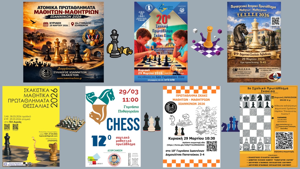 Στη Ζάκυνθο, ο Σκακιστικός Σύλλογος Ζακύνθου συνδιοργανώνει, μαζί με τη Διεύθυνση Α’βαθμιας Εκπαίδευσης, τη Διεύθυνση Β’βαθμιας Εκπαίδευσης και το Δημοτικό Σχολείο Κάμπου “Παναγιώτης Χιώτης”, το 8ο Σχολικό Πρωτάθλημα Σκακιού για τους μαθητές και τις μαθήτριες των Δημοτικών, Γυμνασίων και Λυκείων της Ζακύνθου, την Κυριακή 29 Μαρτίου 2026, στην αίθουσα εκδηλώσεων του Δημοτικού Σχολείου Κάμπου “Παναγιώτης Χιώτης”.